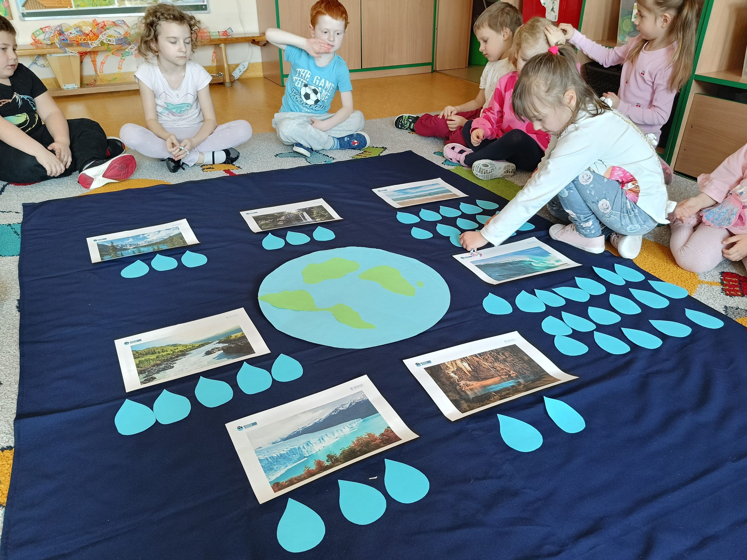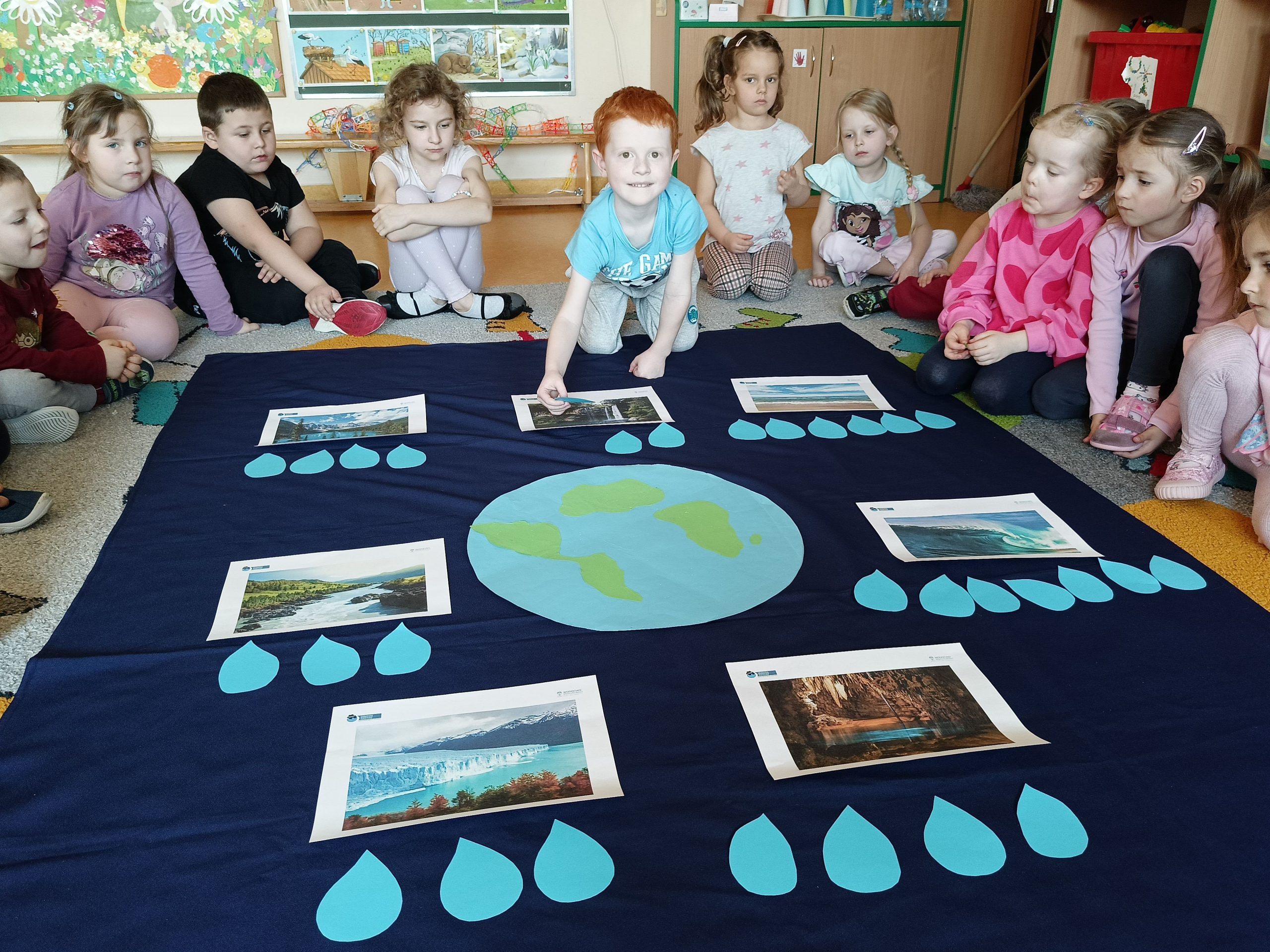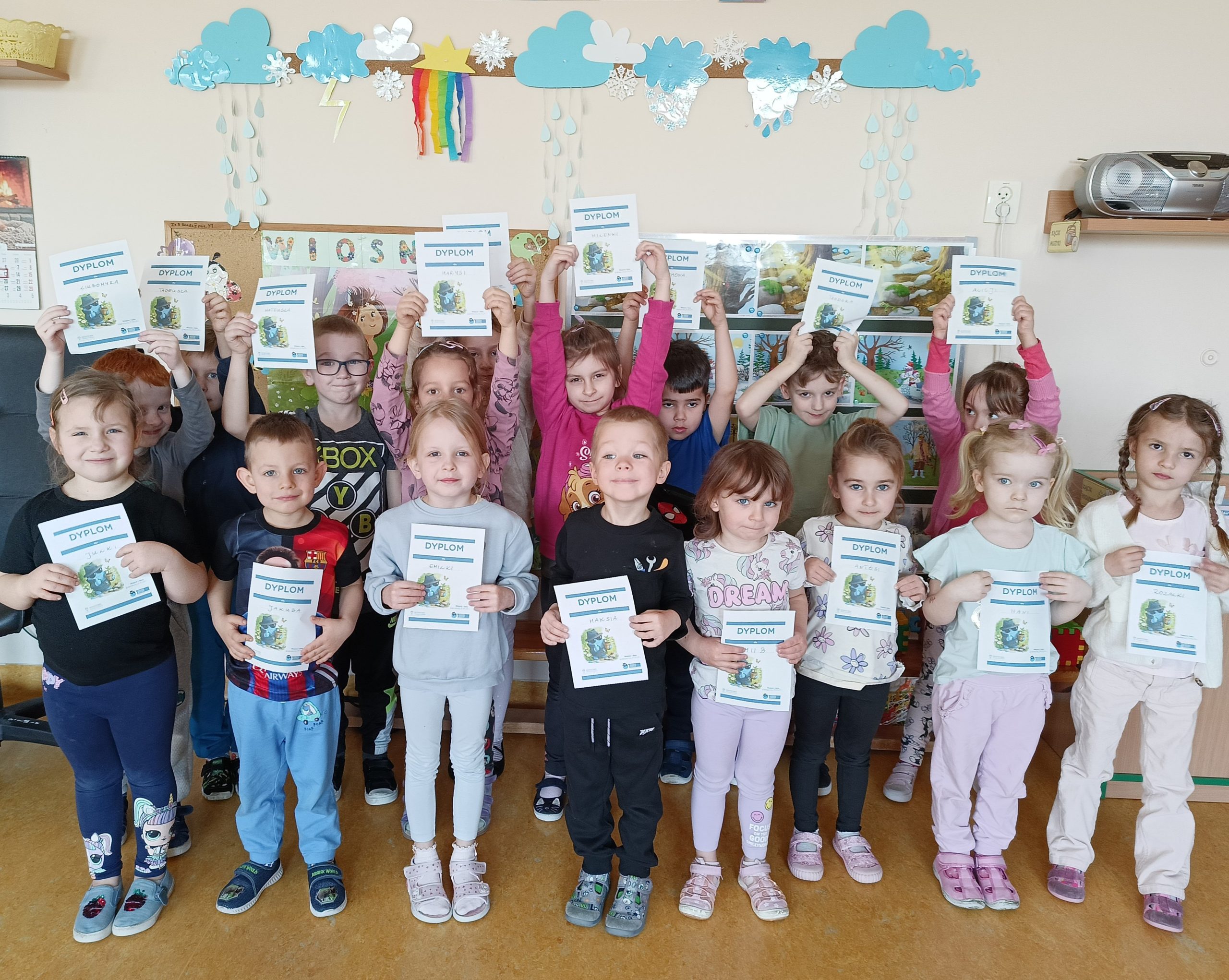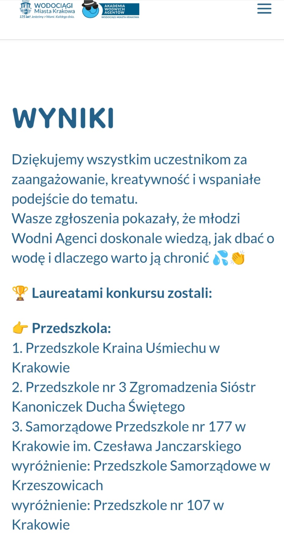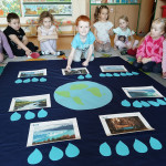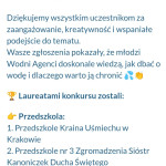 „Akademia Wodnych Agentów” to nowatorski program edukacyjny skierowany do krakowskich przedszkoli oraz klas szkół podstawowych. Inicjatywa zamienia naukę o wodzie w angażującą, interaktywną przygodę, odpowiadającą na współczesne wyzwania klimatyczne. W trakcie zajęć Jeżyki wcieliły się w rolę Wodnych Agentów, odkrywając tajemnice „błękitnego złota” i uczyły się, jak dbać o zasoby wodne w codziennym życiu. Nasza grupa bardzo chętnie zrealizowała następujące zadania: pierwszym zadaniem Agentów była obserwacja wody na Ziemi, następnie odnalezienie wody pitnej na Ziemi. Dzieci określały również jak można oszczędzać wodę w domu. Ustaliły, dlaczego woda pitna jest tak ważna. Na zakończenie misji wszyscy otrzymali dyplom małego Agenta Agencji Ochrony Wody i zostało im powierzone bardzo ważne zadanie, żeby same oszczędzały wodę oraz pokazały innym – mamom, tatom, rodzeństwu – jak to robić.