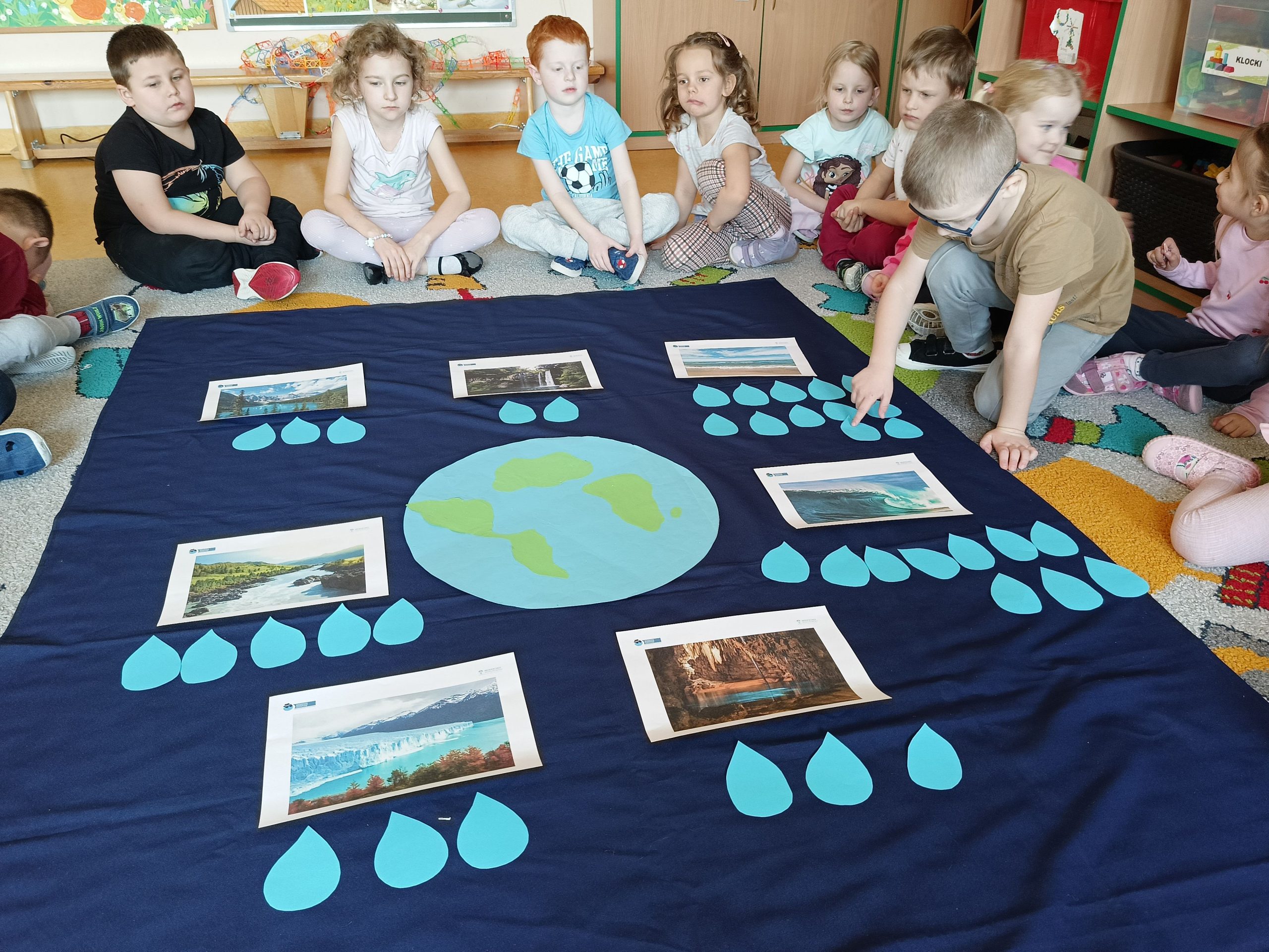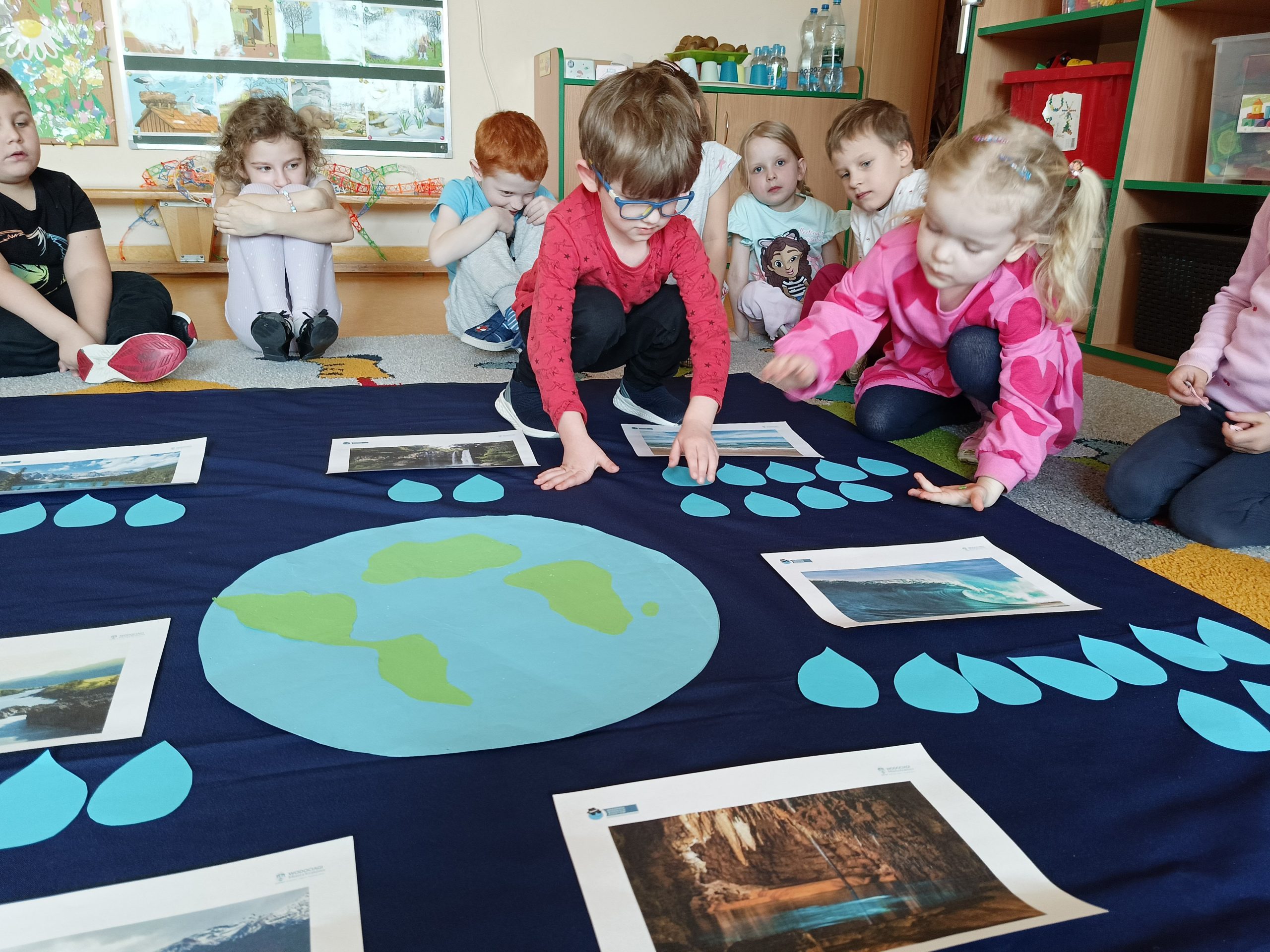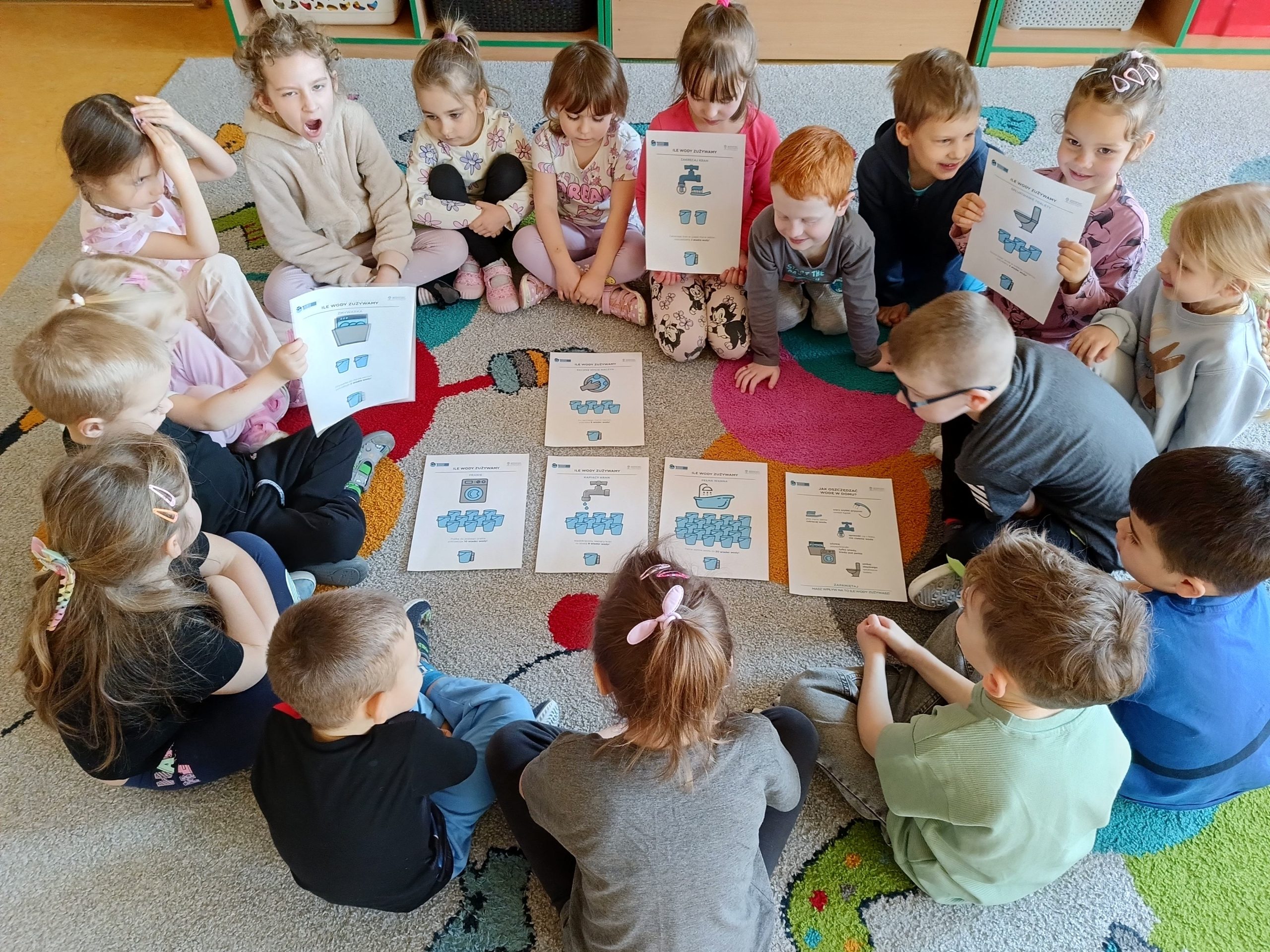 „Akademia Wodnych Agentów” to nowatorski program edukacyjny skierowany do krakowskich przedszkoli oraz klas szkół podstawowych. Inicjatywa zamienia naukę o wodzie w angażującą, interaktywną przygodę, odpowiadającą na współczesne wyzwania klimatyczne. W trakcie zajęć Jeżyki wcieliły się w rolę Wodnych Agentów, odkrywając tajemnice „błękitnego złota” i uczyły się, jak dbać o zasoby wodne w codziennym życiu. Nasza grupa bardzo chętnie zrealizowała następujące zadania: pierwszym zadaniem Agentów była obserwacja wody na Ziemi, następnie odnalezienie wody pitnej na Ziemi. Dzieci określały również jak można oszczędzać wodę w domu. Ustaliły, dlaczego woda pitna jest tak ważna. Na zakończenie misji wszyscy otrzymali dyplom małego Agenta Agencji Ochrony Wody i zostało im powierzone bardzo ważne zadanie, żeby same oszczędzały wodę oraz pokazały innym – mamom, tatom, rodzeństwu – jak to robić.