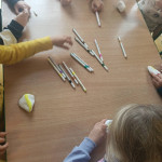 W deszczowy , pochmurny poniedziałek, 6.10.2025r. grupa Motylki poznawała sposoby na nudę. Jednym z nich było malowanie kamieni pisakami akrylowymi. Aktywność ta jest jednym z zadań projektu „Chwila dla sztuki” realizowanego w tejże grupie. Dzieci najpierw badały kamienie dotykiem, oceniając jego ciężar, fakturę, temperaturę(okazało się, że są zimne!) a także określały ich kolor i kształt. Następnie każde dziecko wybrało sobie jeden kamień i przystąpiło do ozdabiania go. Jak się okazało – ile dzieci, tyle pomysłów! Po zakończeniu zadania Motylki udały się do parku aby ukryć kamyczki w różnych miejscach.