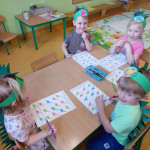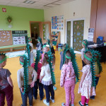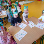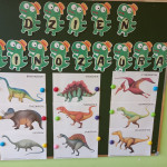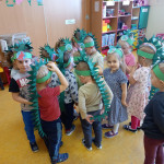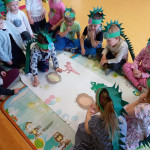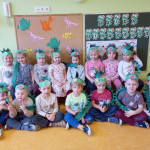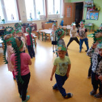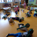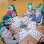Dzieci z grupy 5 założyły na głowę wykonane przez wychowawczynię opaski, dzięki którym wyglądały jak stegozaury i bawiły się w ciekawe zabawy muzyczno-ruchowe: „Dinozaury szukają swojej rodziny”, „Jaki to dinozaur?”- ucząc się naśladować i rozpoznawać różne gatunki dinozaurów. Klasyfikowały dinozaury na małe i duże, a także mięsożerne