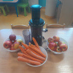 Kulminacyjnym punktem dnia było samodzielne przygotowywanie soków ze świeżych jabłek i marchwi. Dzieci z ogromnym zaangażowaniem obserwowały pracę sokowirówki, a następnie z radością degustowały naturalny sok, który samodzielnie przygotowały. To była doskonała okazja do rozmów o wartościach odżywczych i zdrowych nawykach żywieniowych.