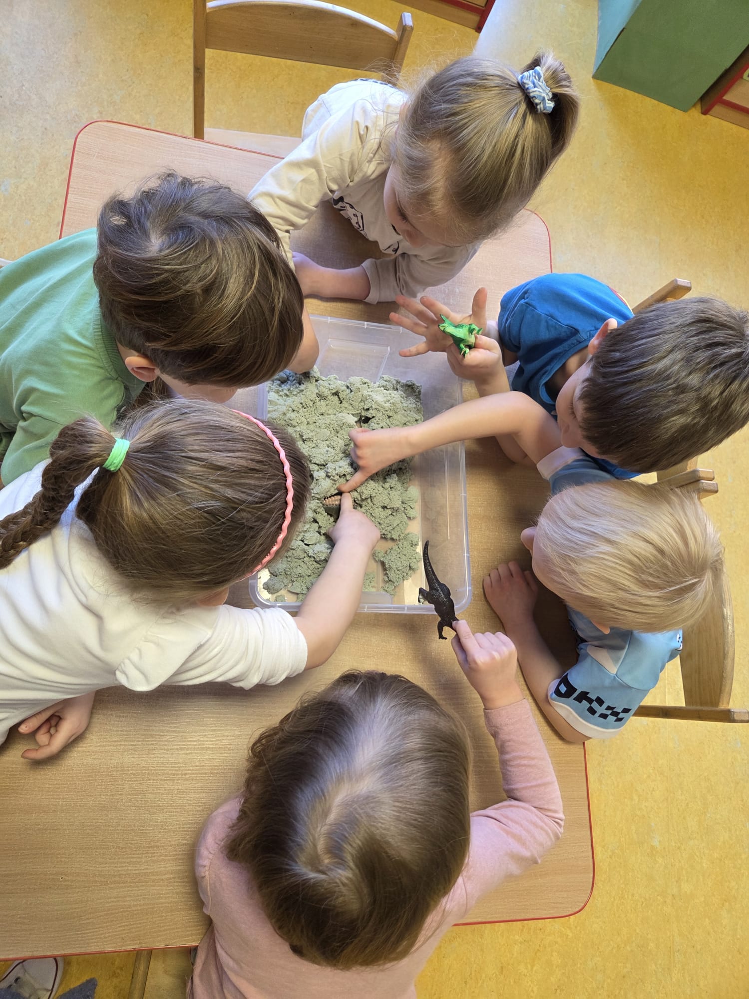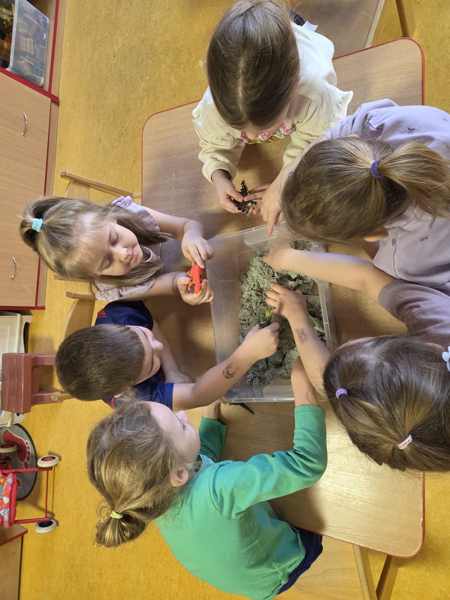 Obchody Dnia Dinozaura w grupie „Sówki” były niezwykle udane i pełne fascynujących atrakcji! Naszą prehistoryczną podróż rozpoczęliśmy od poznania historii odkrycia tych niezwykłych gadów. Dzieci błyskawicznie zamieniły się w prawdziwych paleontologów, z ogromnym zaangażowaniem odkopując z piasku ukryte figurki dinozaurów.