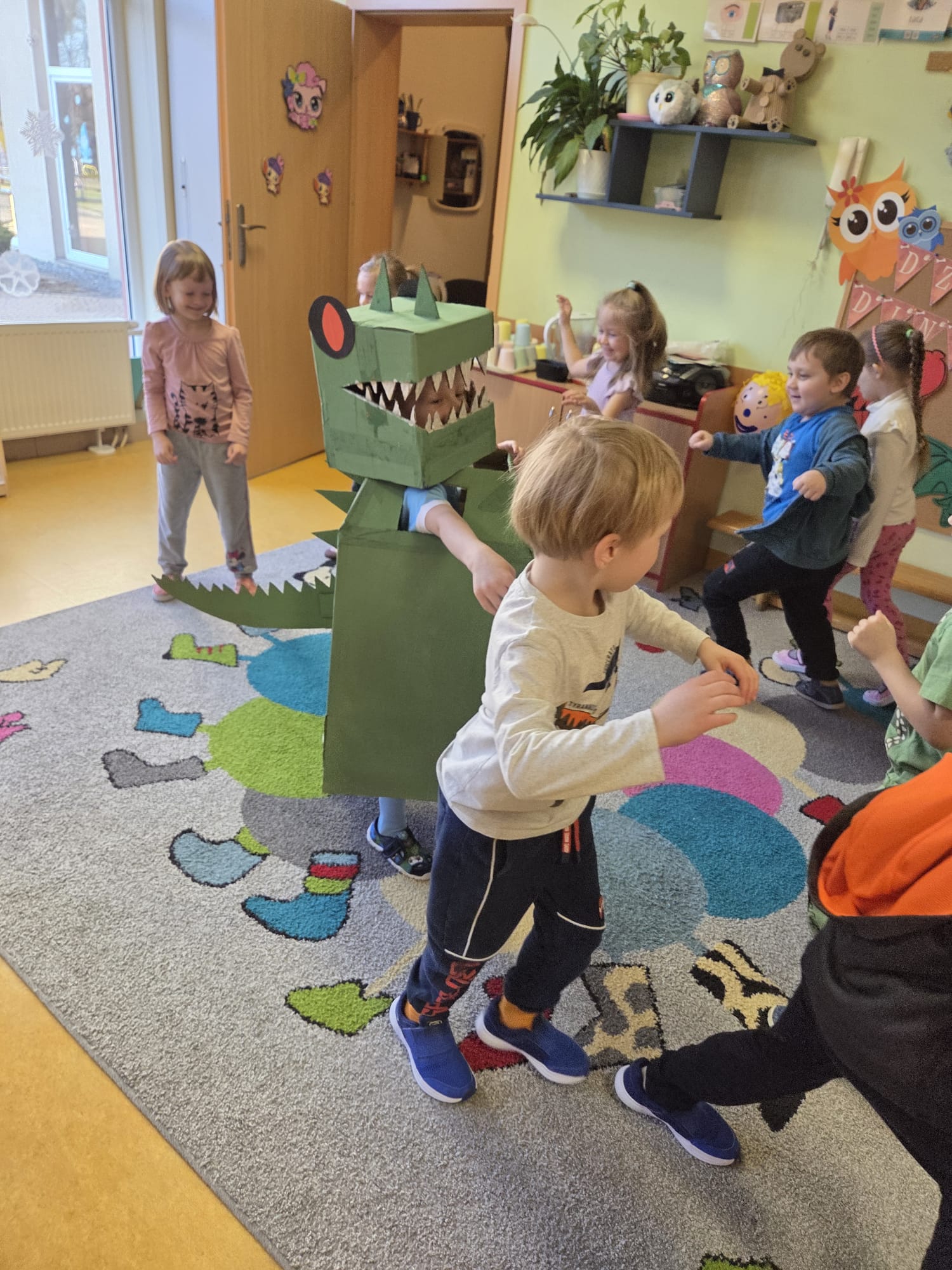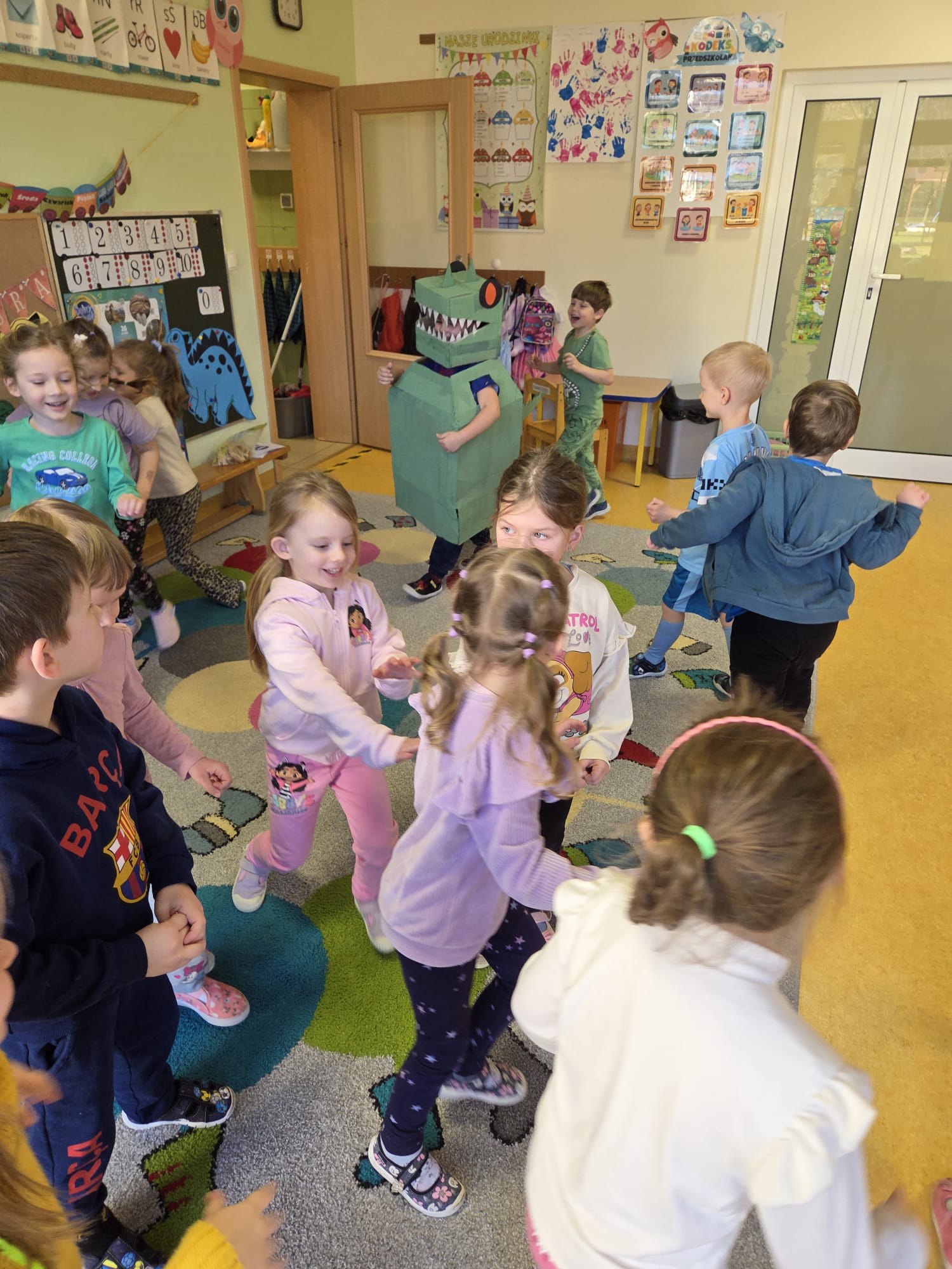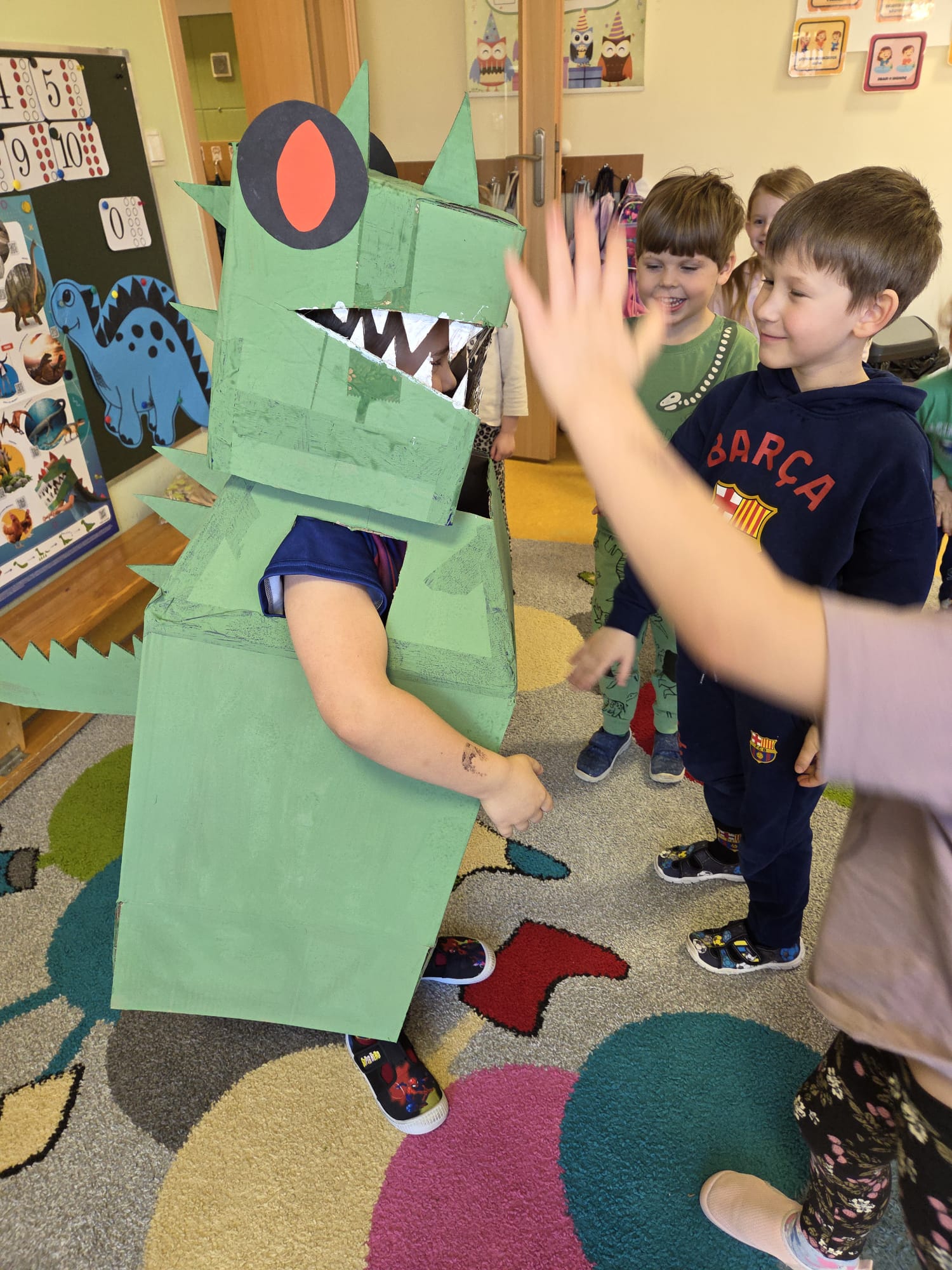 Kolejnym etapem było odkrywanie tajemnic narodzin tych stworzeń. Przedszkolaki poprzez świetną zabawę ruchową naśladowały proces wykluwania się z jajka, a następnie zamieniały się w latające i ciężko stąpające po ziemi dinozaury. Nie zabrakło też ćwiczeń matematycznych i motorycznych – dzieci z entuzjazmem przypinały do tekturowych dinozaurów dokładnie tyle klamerek, ile kropek znajdowało się na wylosowanych brzuszkach.