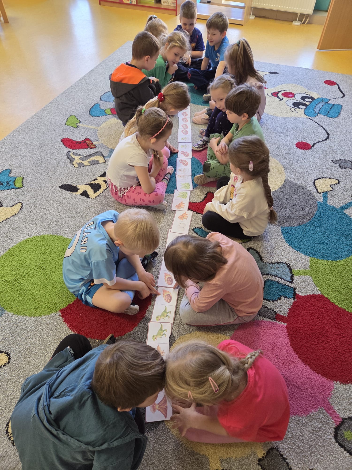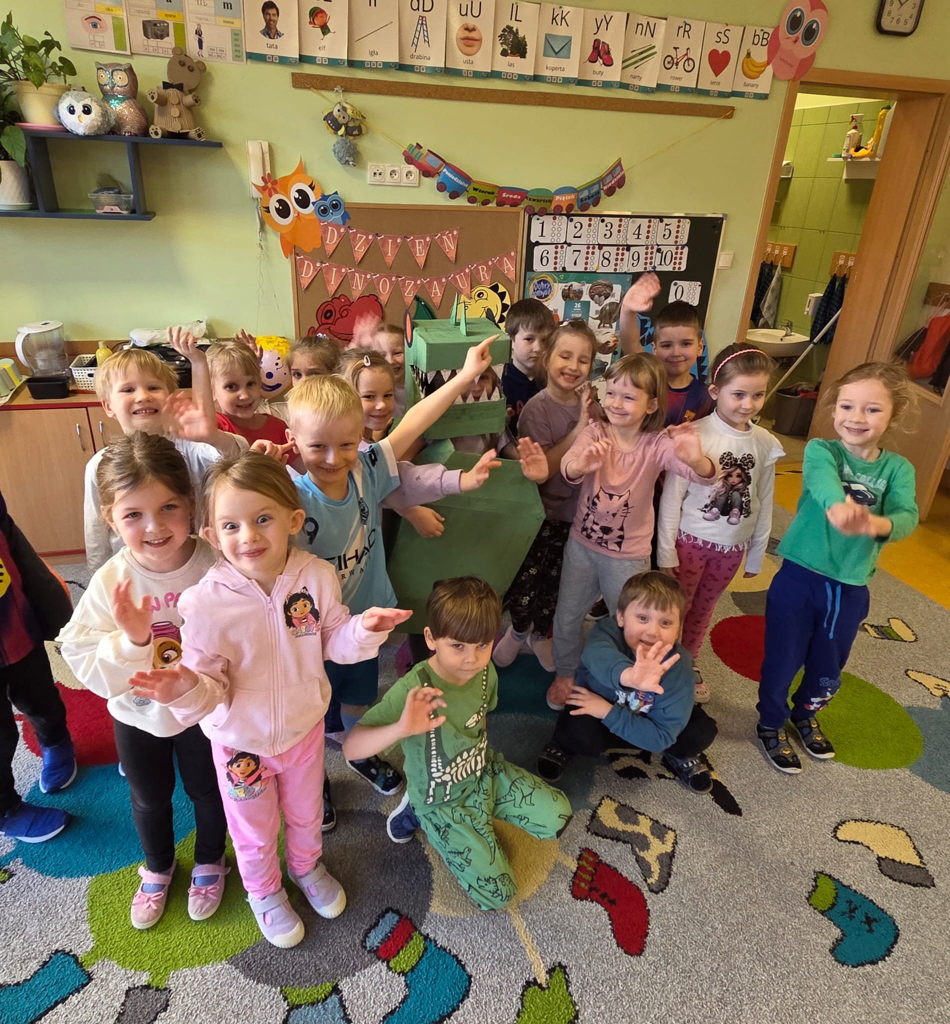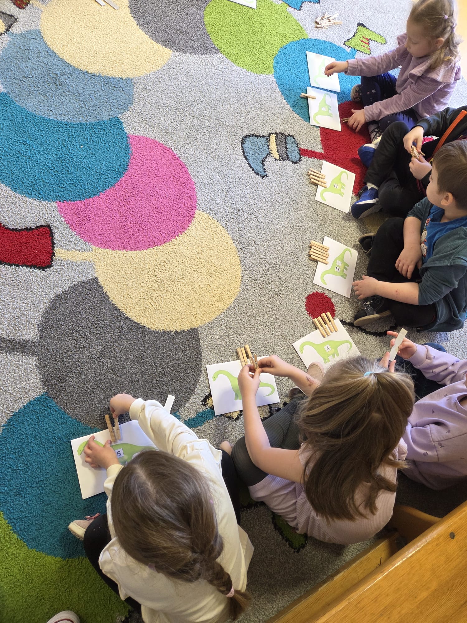 Kolejnym etapem było odkrywanie tajemnic narodzin tych stworzeń. Przedszkolaki poprzez świetną zabawę ruchową naśladowały proces wykluwania się z jajka, a następnie zamieniały się w latające i ciężko stąpające po ziemi dinozaury. Nie zabrakło też ćwiczeń matematycznych i motorycznych – dzieci z entuzjazmem przypinały do tekturowych dinozaurów dokładnie tyle klamerek, ile kropek znajdowało się na wylosowanych brzuszkach.