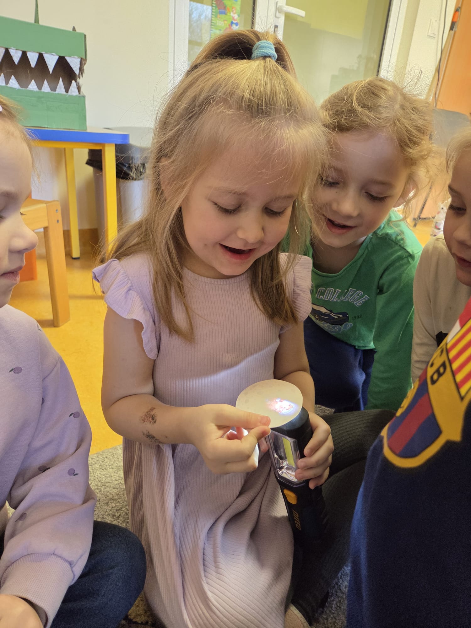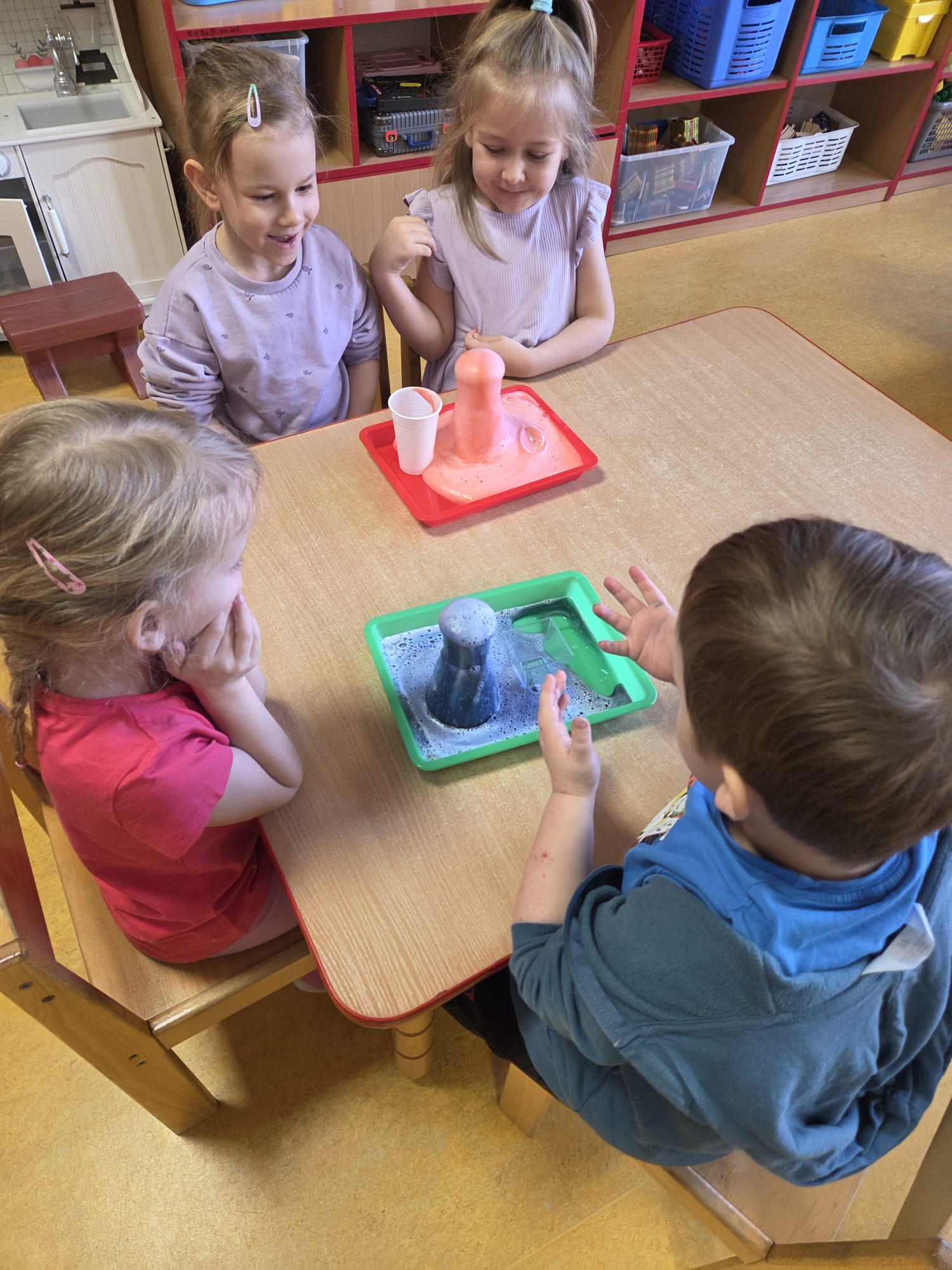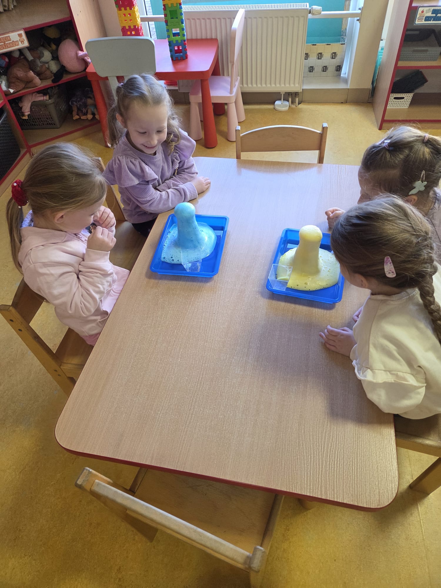 Prawdziwym hitem okazały się zajęcia badawcze. Pracując w parach, „Sówki” przeprowadziły efektowny eksperyment – po dodaniu octu do pojemników z sodą i barwnikiem, na ich oczach wybuchły zachwycające, kolorowe wulkany!