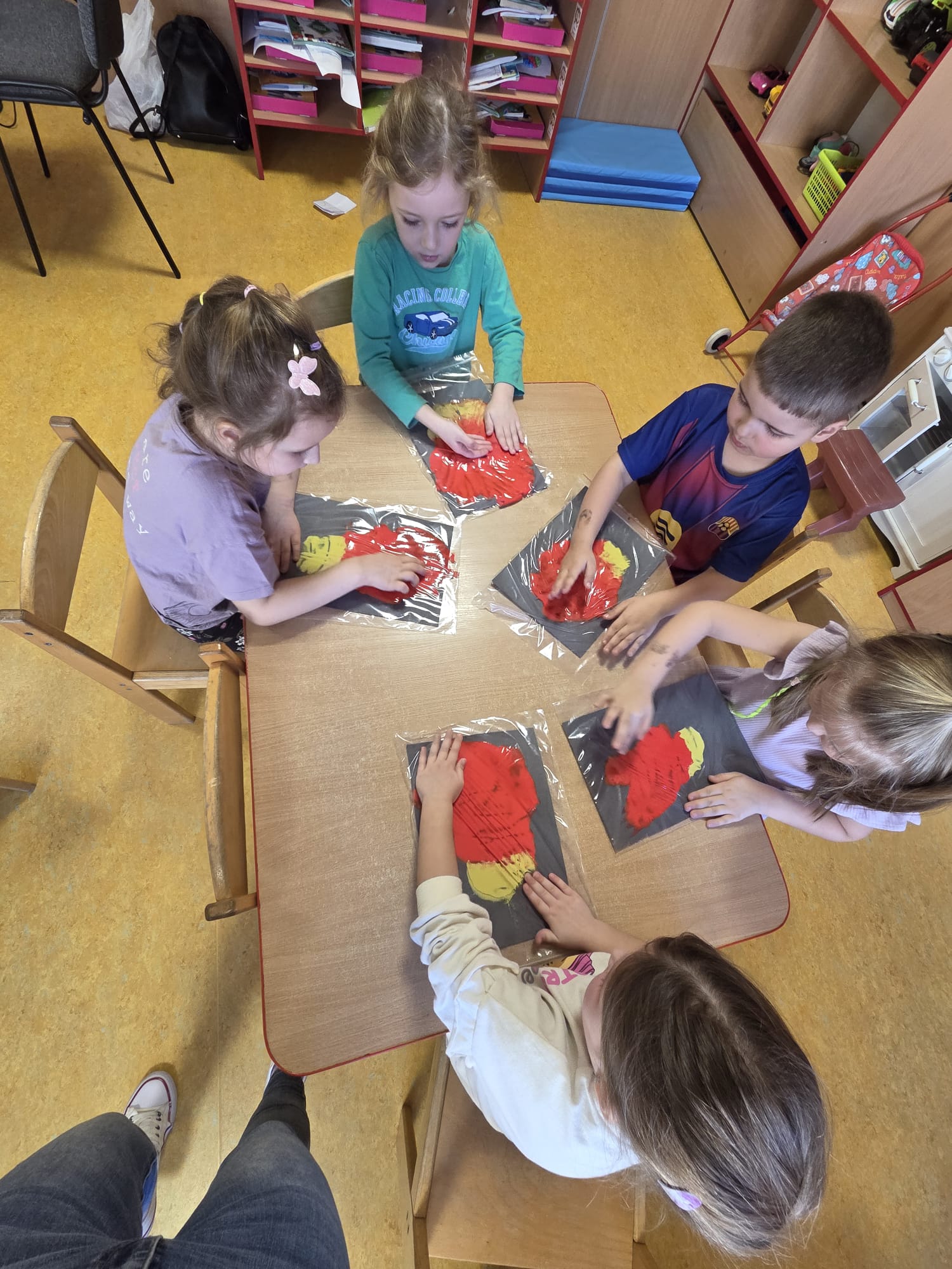 Ogromną dawkę śmiechu przyniosła również zabawa ruchowa. Jedno z dzieci, ubrane w imponujący, kartonowy strój dinozaura, miało za zadanie gonić i „zamrażać” uciekających kolegów i koleżanki. Ten wyjątkowy, pełen emocji dzień podsumowaliśmy działalnością twórczą – dzieci stworzyły własne, wybuchające wulkany, efektownie rozcierając farbę palcami na kartkach.