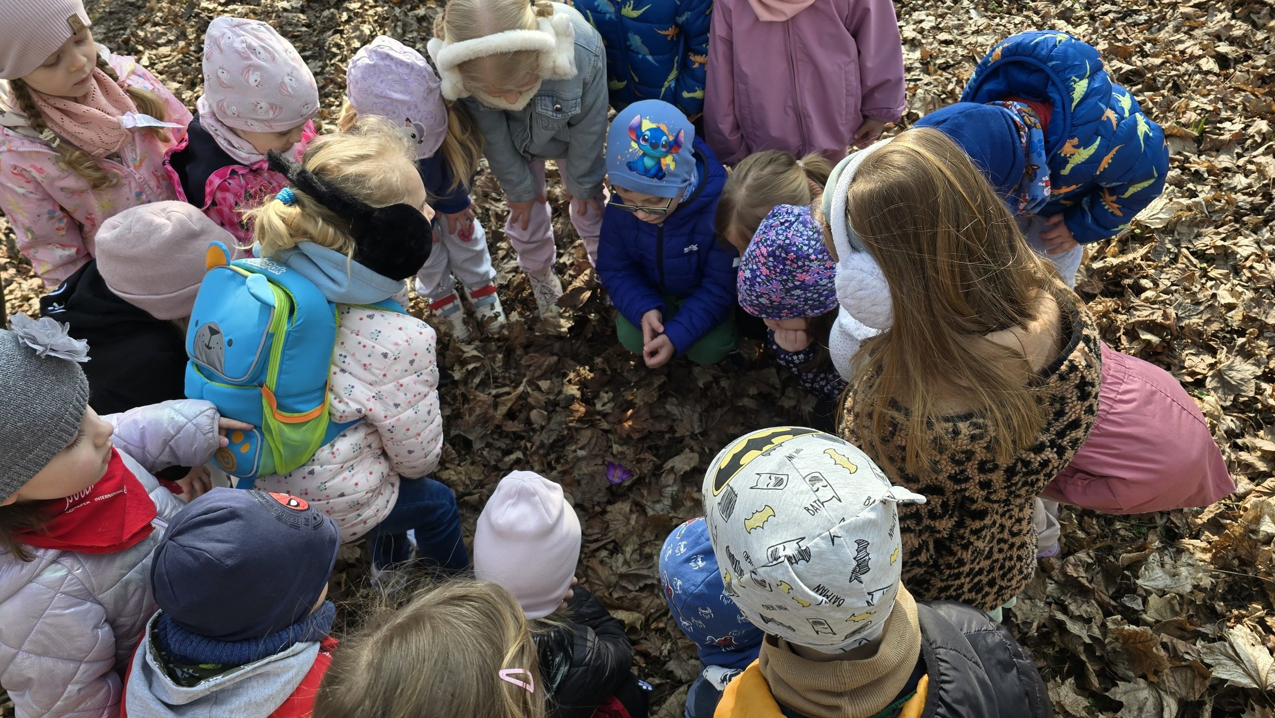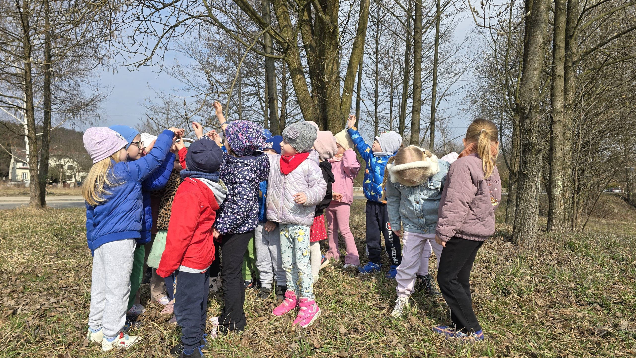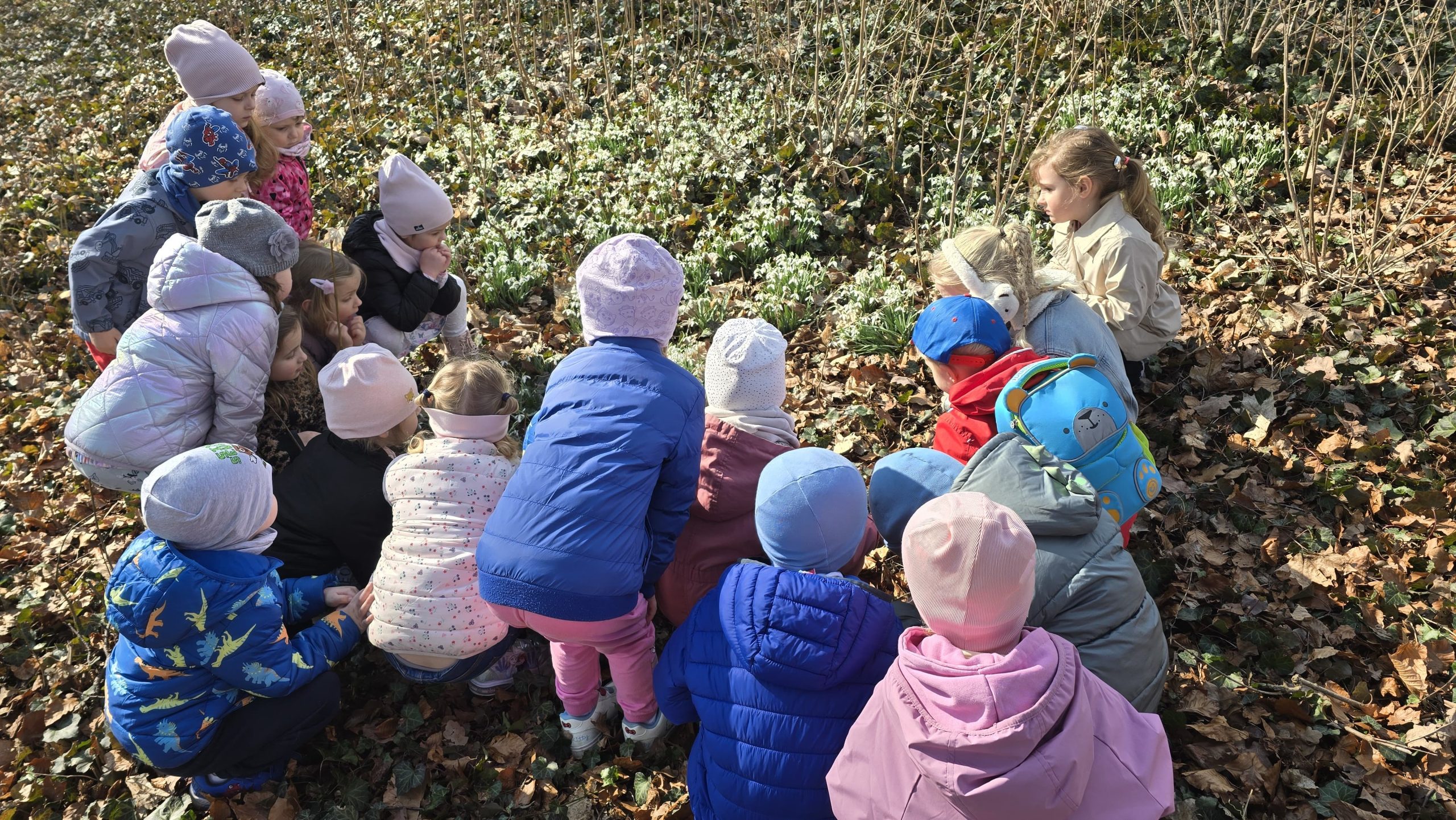 Podczas spaceru przedszkolaki uważnie obserwowały przyrodę. Już po chwili udało się znaleźć piękne przebiśniegi, które nieśmiało wychylały się z ziemi. Był też jeden odważny krokus, który jako pierwszy zakwitł wśród trawy. Dzieci dostrzegły również bazie kotki na gałązkach oraz małe pąki na drzewach, które powoli przygotowują się do rozkwitu.