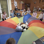 Nie mogło zabraknąć ruchu! Nasze pluszaki zostały zaproszone na wyjątkową przejażdżkę – karuzelę na chuście animacyjnej. Po szalonej zabawie nadszedł czas na wyciszenie. Dzieci delikatnie kołysały swoje maskotki na chuście, aż wszystkie misie poczuły się zrelaksowane i „uśpione”.