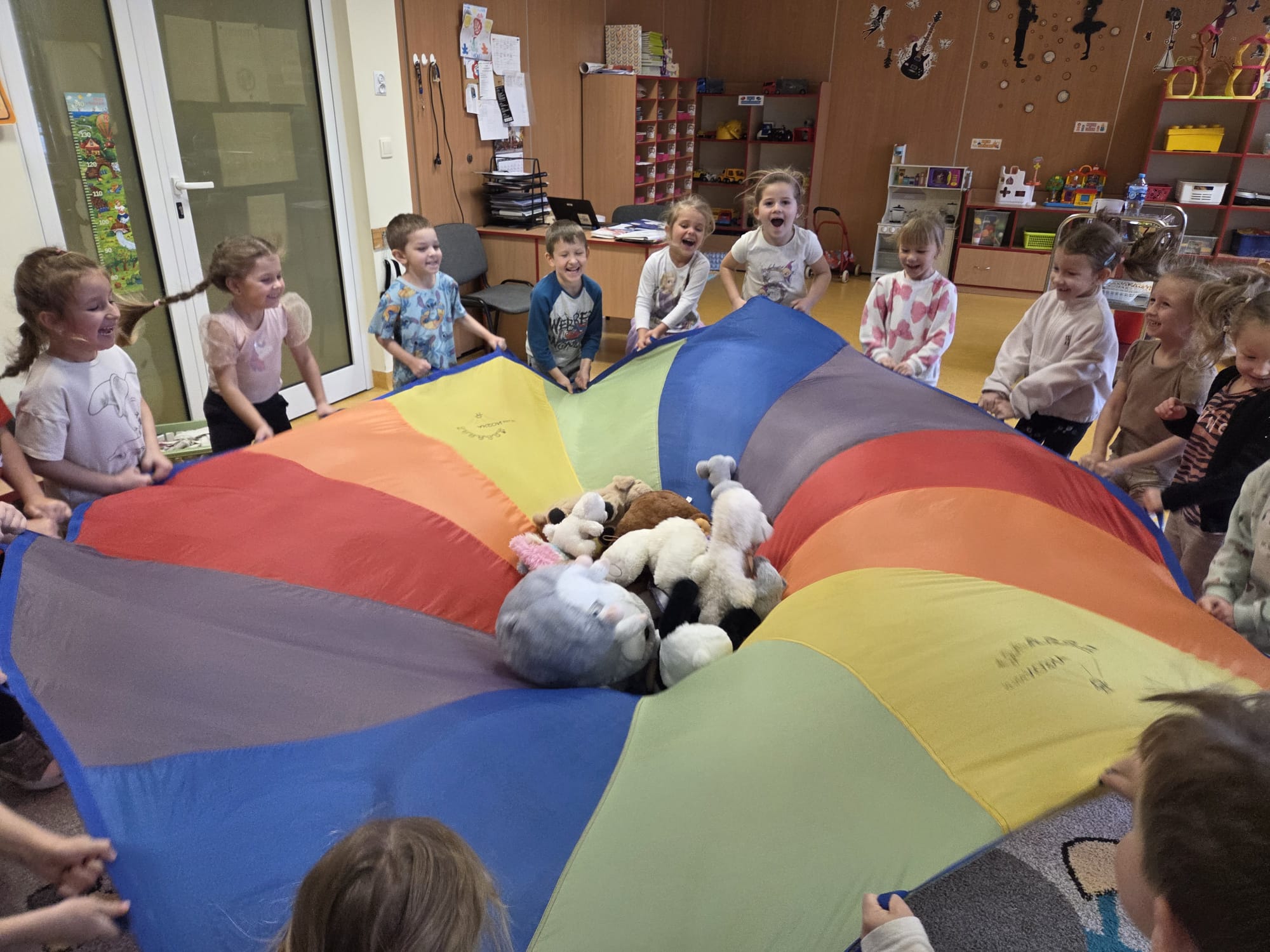 Nie mogło zabraknąć ruchu! Nasze pluszaki zostały zaproszone na wyjątkową przejażdżkę – karuzelę na chuście animacyjnej. Po szalonej zabawie nadszedł czas na wyciszenie. Dzieci delikatnie kołysały swoje maskotki na chuście, aż wszystkie misie poczuły się zrelaksowane i „uśpione”.