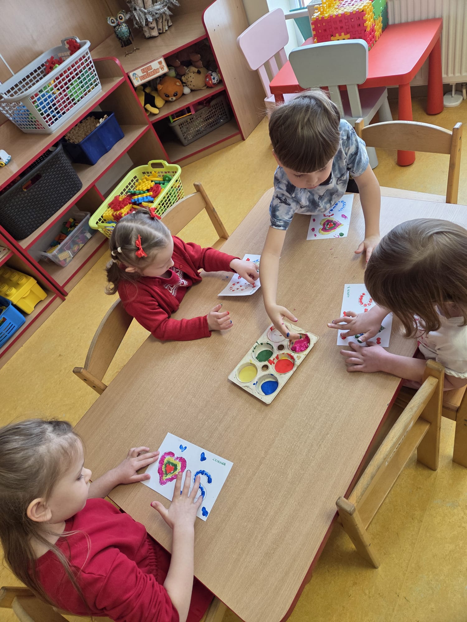 Dzieci przygotowały przepiękne, walentynkowe obrazki. Pełne czerwieni, prace z pewnością trafią do serc rodziców.