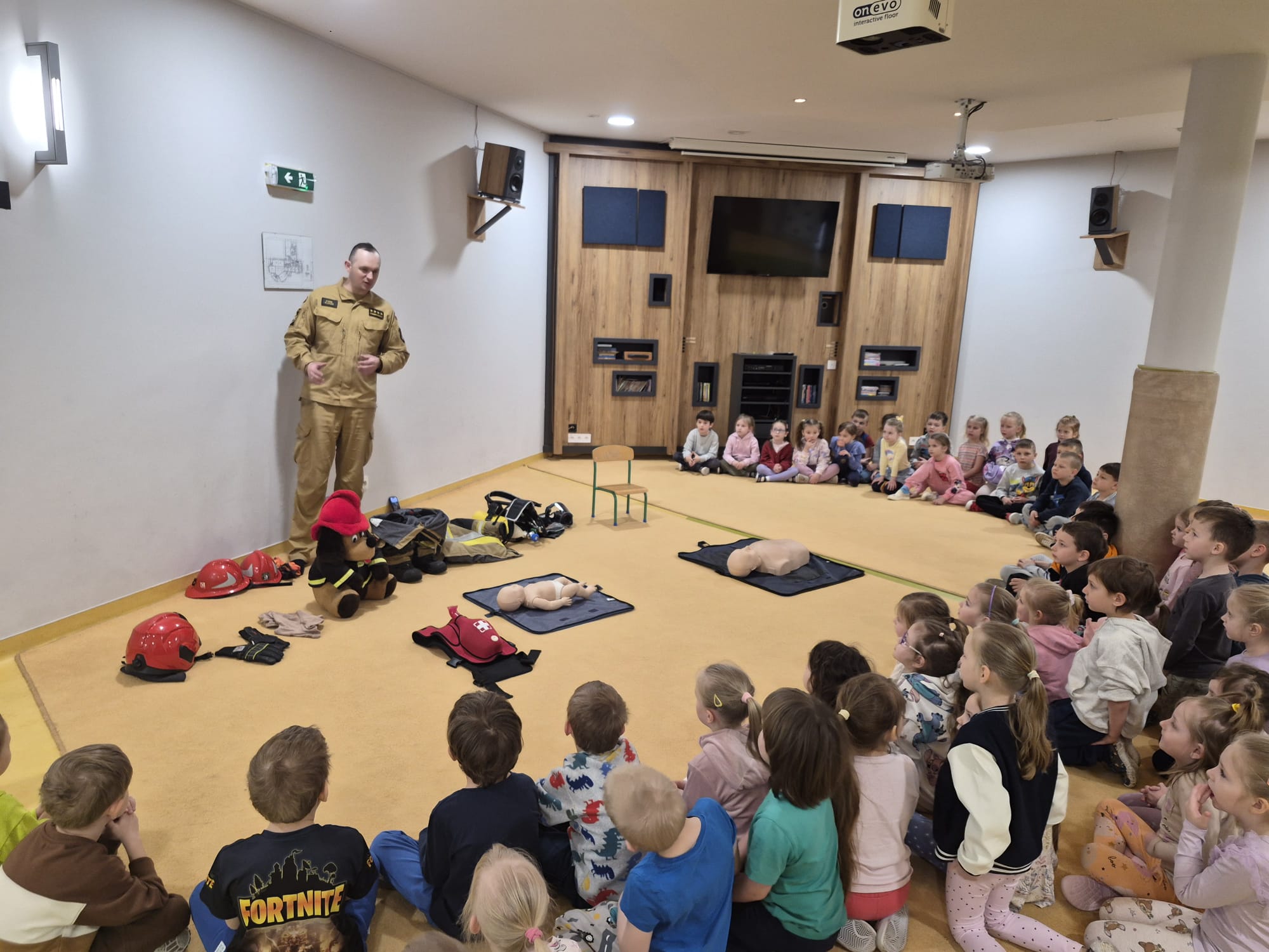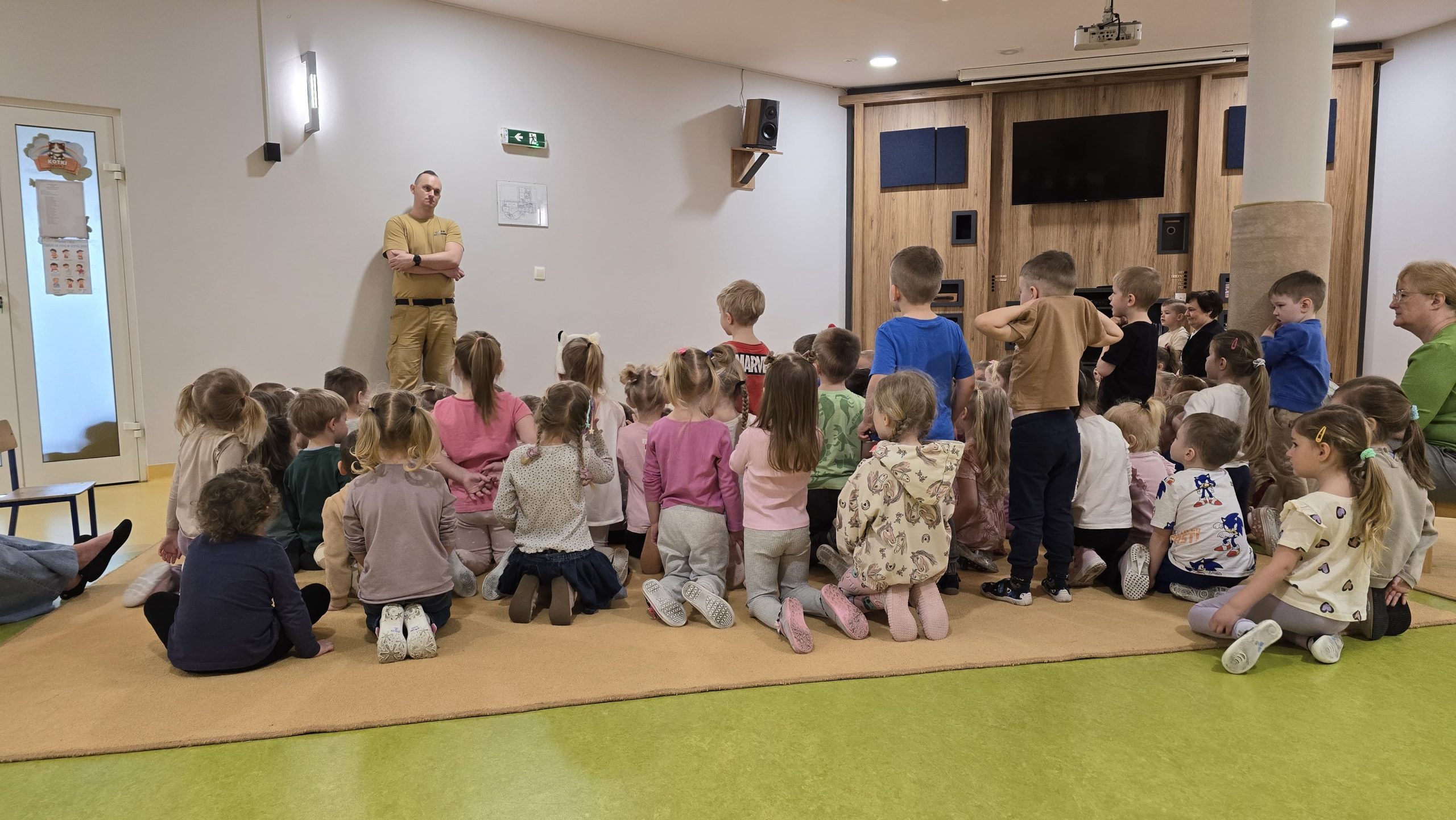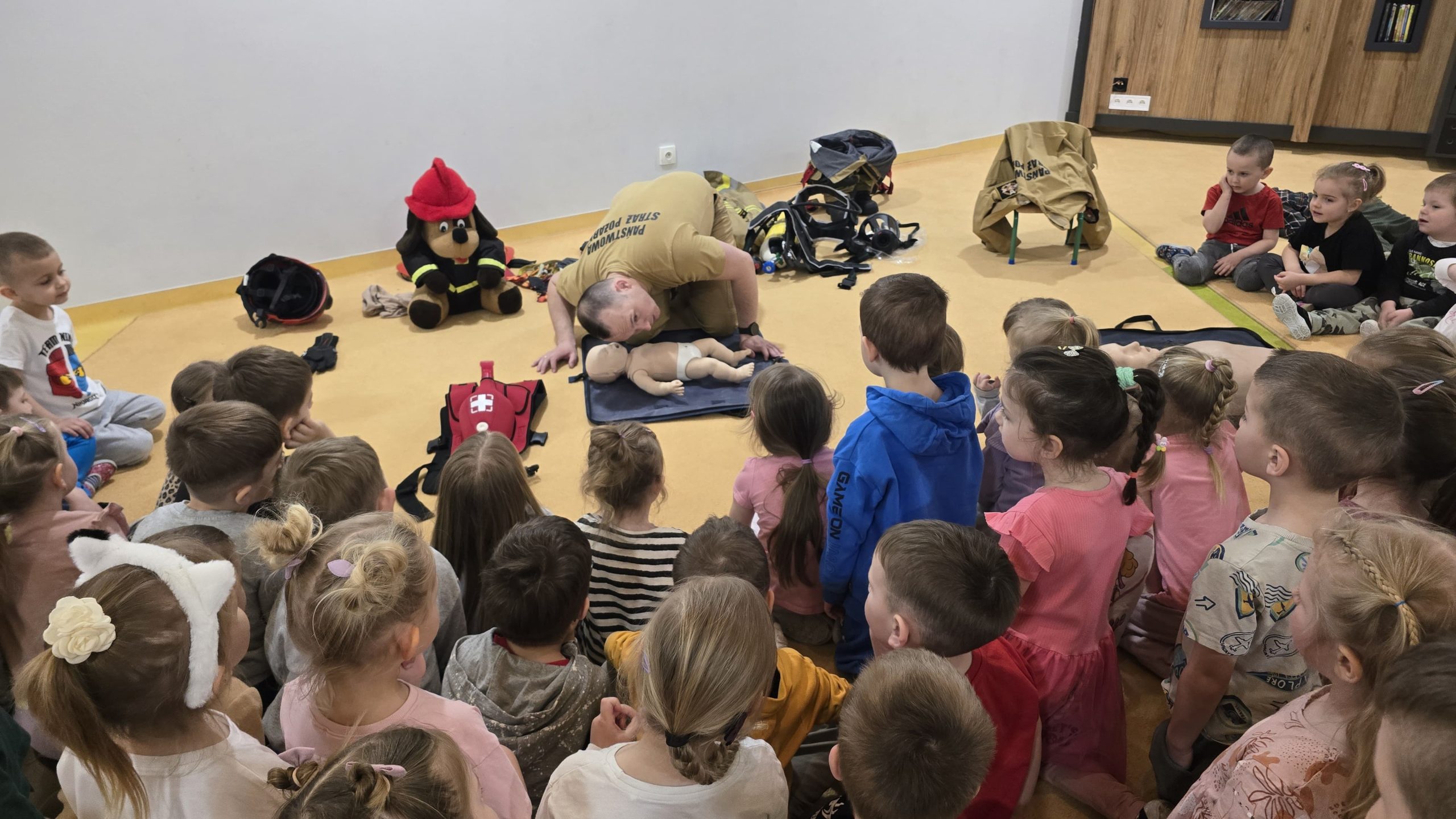Podczas spotkania dzieci miały okazję dowiedzieć się, na czym polega praca strażaka oraz jak ważna jest szybka i odpowiednia reakcja w sytuacjach zagrożenia. Nasz gość opowiedział o zasadach udzielania pierwszej pomocy, przypomniał numery alarmowe oraz wyjaśnił, jak należy zachować się w przypadku pożaru czy wypadku. Przedszkolaki z dużym zainteresowaniem słuchały i chętnie odpowiadały na pytania.
