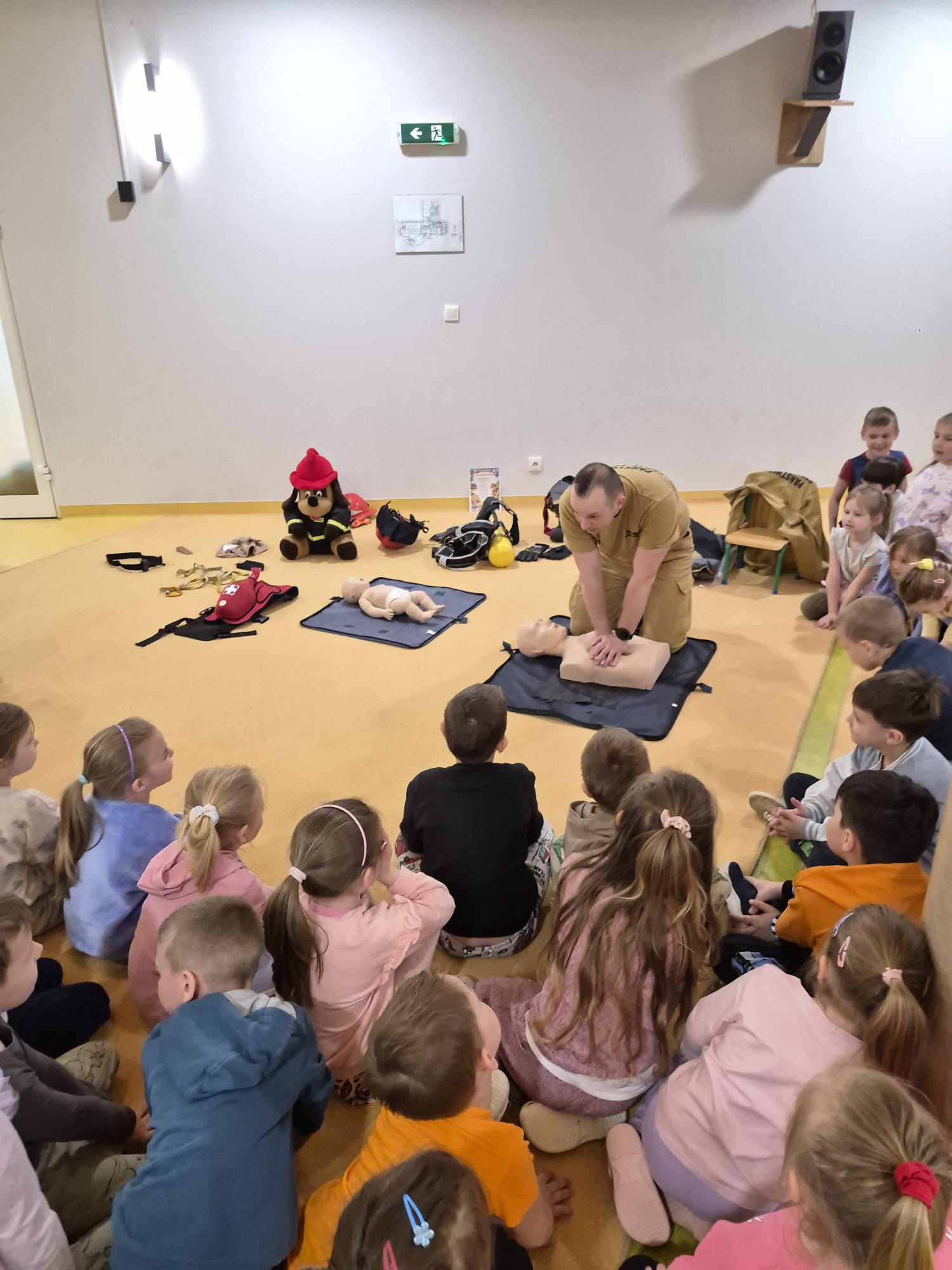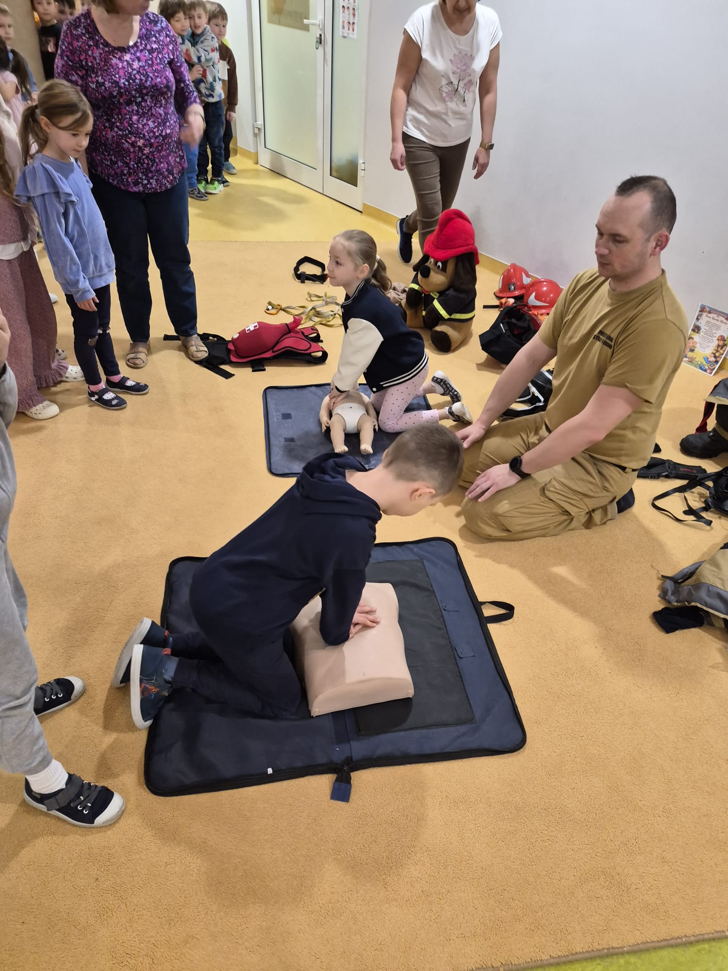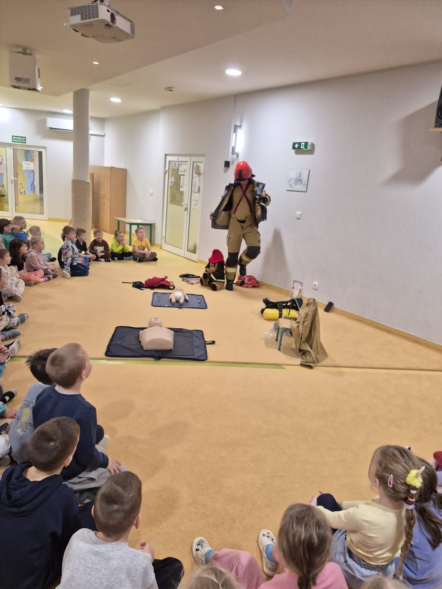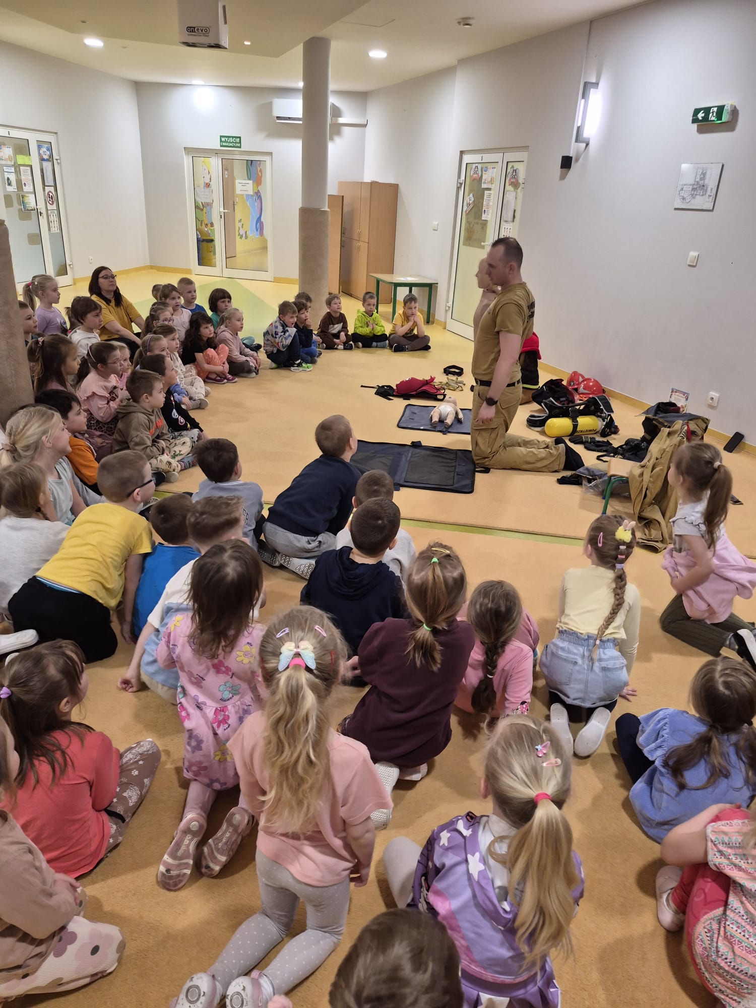 Podczas spotkania dzieci miały okazję dowiedzieć się, na czym polega praca strażaka oraz jak ważna jest szybka i odpowiednia reakcja w sytuacjach zagrożenia. Nasz gość opowiedział o zasadach udzielania pierwszej pomocy, przypomniał numery alarmowe oraz wyjaśnił, jak należy zachować się w przypadku pożaru czy wypadku. Przedszkolaki z dużym zainteresowaniem słuchały i chętnie odpowiadały na pytania.