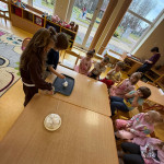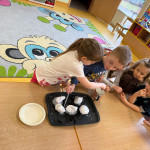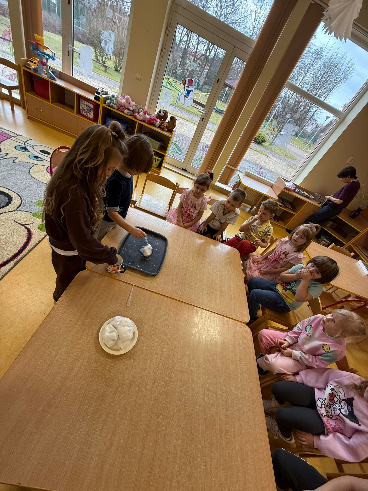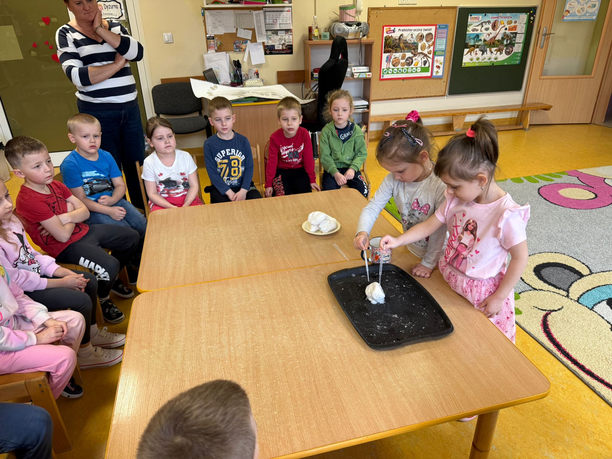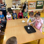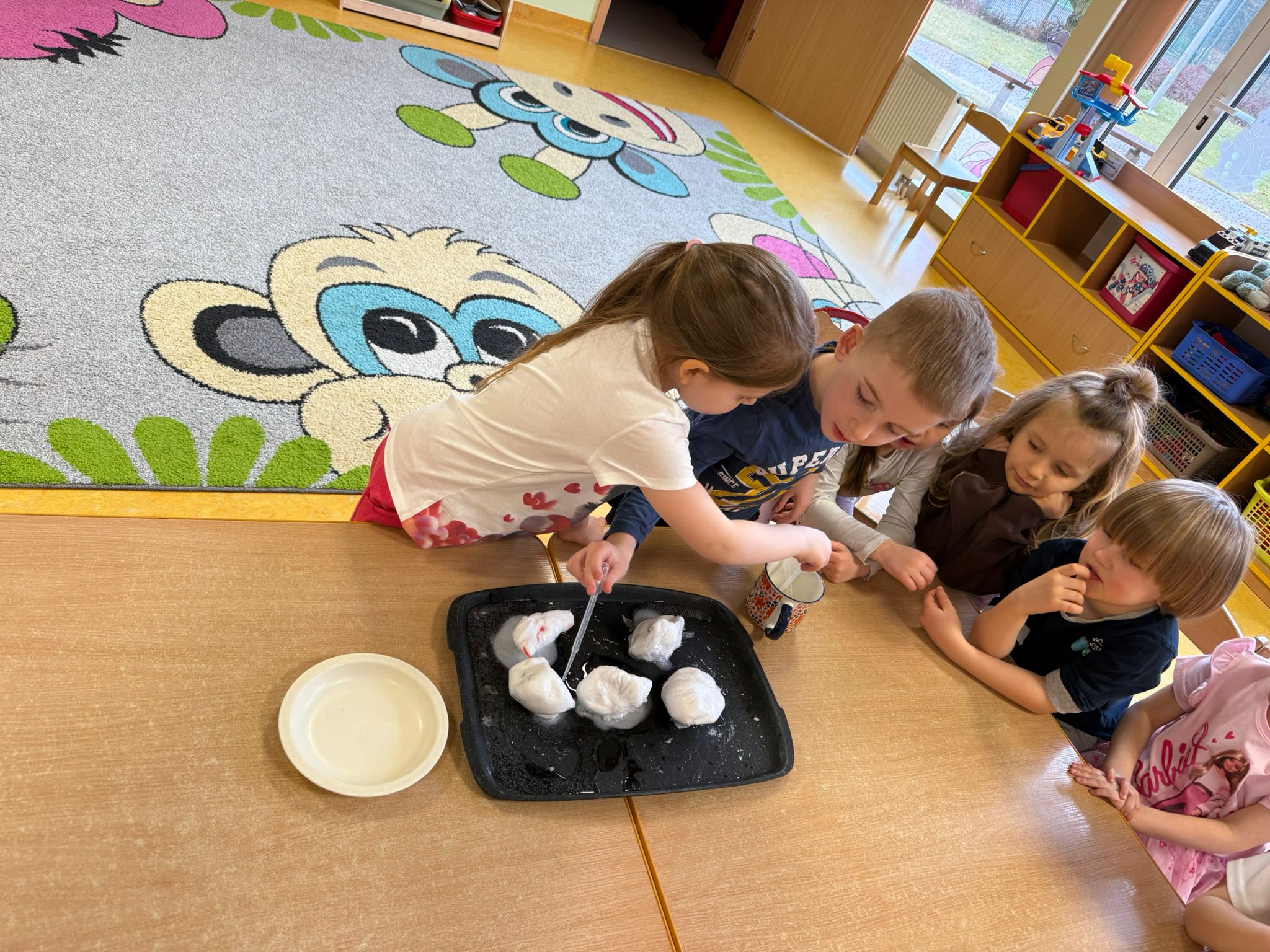 Dzieci używały pipetek z octem, aby polewać tajemnicze „niby-jaja” z sody oczyszczonej. Gdy masa zaczęła syczeć i się rozpuszczać, oczom przedszkolaków ukazywały się figurki różnych gatunków dinozaurów. Radość z każdego „wyklutego” osobnika była ogromna!