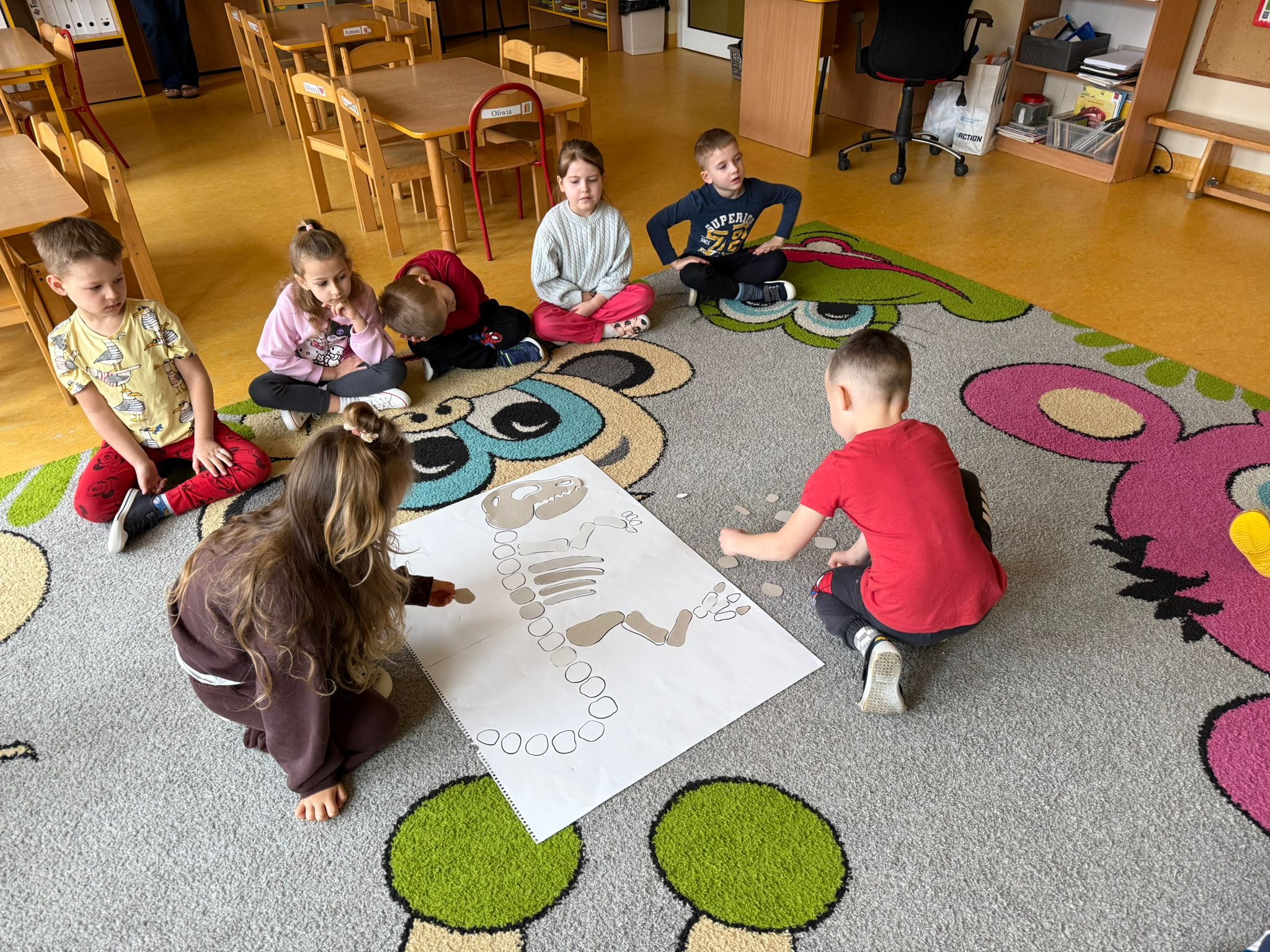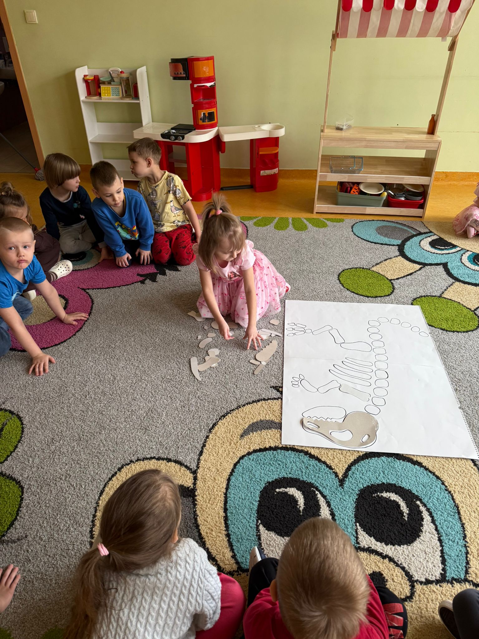 To nie był jednak koniec atrakcji! Dzieci wzięły udział w mini zabawie paleontologicznej. Z wielką precyzją i cierpliwością składały szkielet dinozaura, ucząc się przy tym budowy tych fascynujących stworzeń.