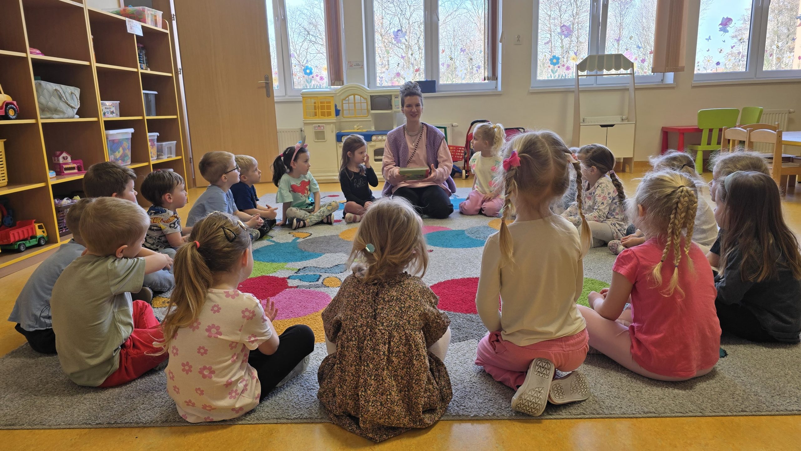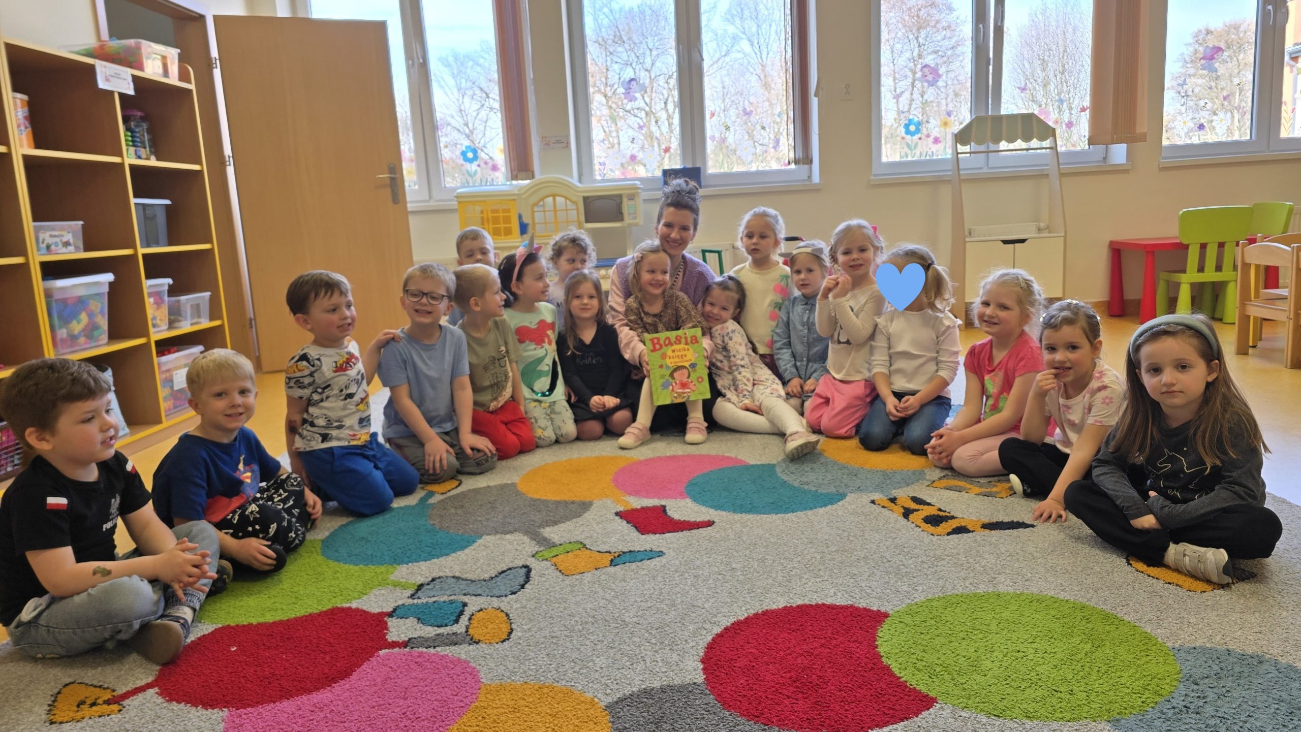 Pani Małgosia przeczytała dzieciom krótkie fragmenty z książki „Basia. Wielka księga o uczuciach”, które opowiadają o różnych emocjach towarzyszących nam na co dzień. Teksty w przystępny sposób pokazują dzieciom, czym są uczucia i w jakich sytuacjach mogą się pojawiać.