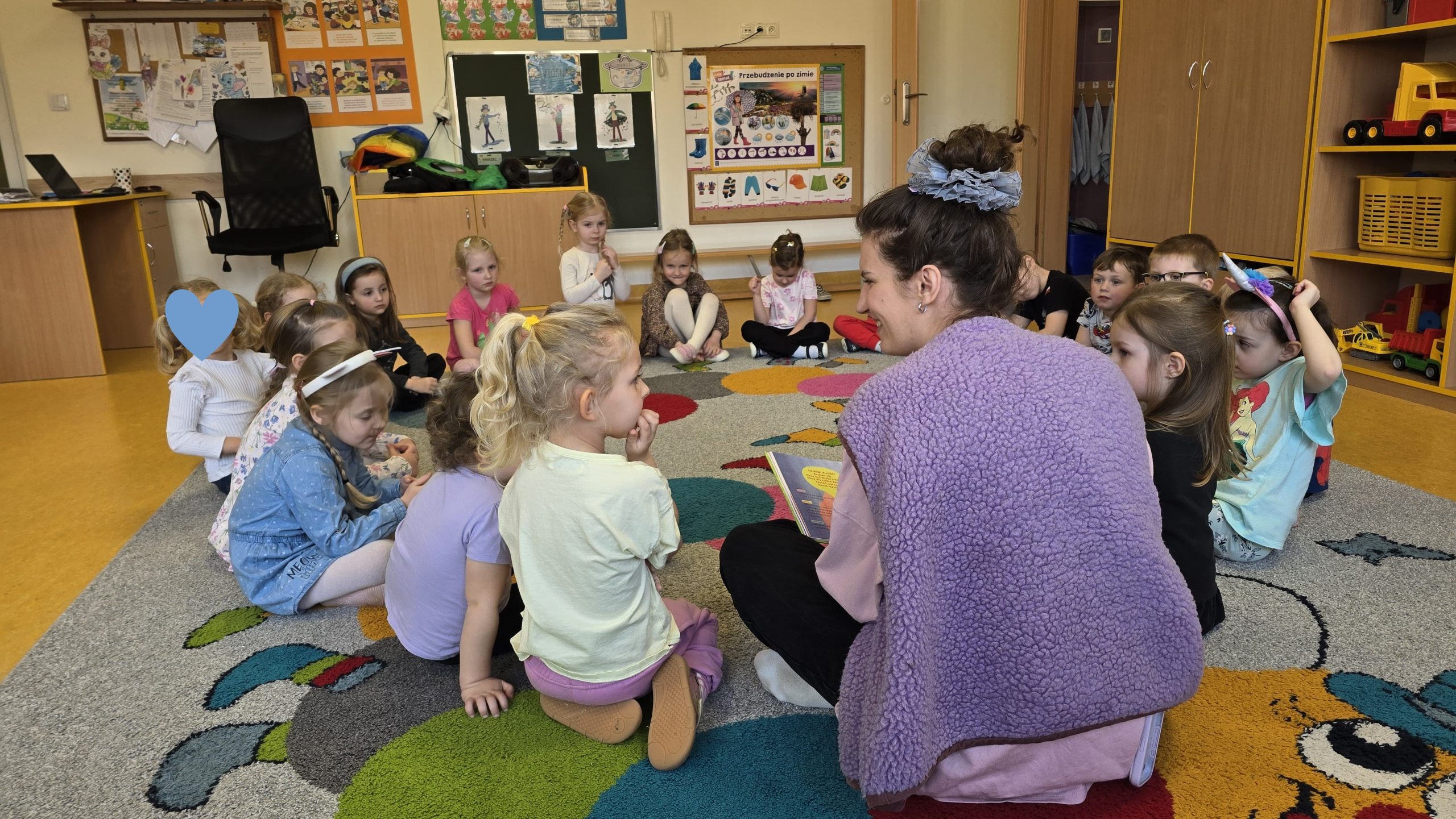 Podczas spotkania rozmawialiśmy o emocjach takich jak miłość, radość oraz złość. Dzieci chętnie dzieliły się swoimi doświadczeniami i opowiadały o tym, kiedy czują radość, co sprawia im przyjemność oraz w jakich sytuacjach pojawia się złość.
