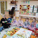 18 października przypada Światowy Dzień Owoców i Warzyw. W naszej grupie był obchodzony kilka dni wcześniej. Głównym celem było zachęcenie dzieci do spożywania warzyw i owoców. W sali zapachniało owocami i warzywami, przedszkolaki zajęły się przygotowaniem owocowo-warzywnych pyszności. Tydzień ten upłynął nie tylko na samych przygotowaniach i degustacji witaminowych dobroci, były również zabawy muzyczno-ruchowe, praca plastyczna, układanki związane z wydarzeniem. Zaangażowanie dzieci pokazało, że warzywa i owoce staną się nieodzownym elementem ich codziennej diety. Jesteśmy pewni, iż po tak atrakcyjnie obchodzonym tygodniu nie trzeba będzie dłużej nikogo przekonywać, że owoce i warzywa są podstawą zdrowego odżywiania i należy je spożywać. Współtwórcami tego wydarzenia byli także rodzice, którzy zaopatrzyli swoje pociechy w owoce. Dzieci z grupy „Jeżyki” miały okazje samodzielnie przygotować kolorowe kanapki warzywne na śniadanie oraz pyszne i zdrowe jeżyki owocowe.
